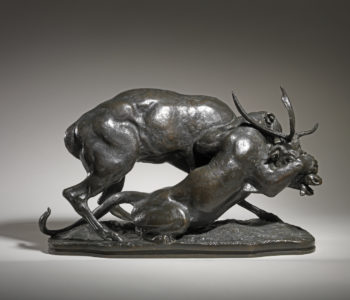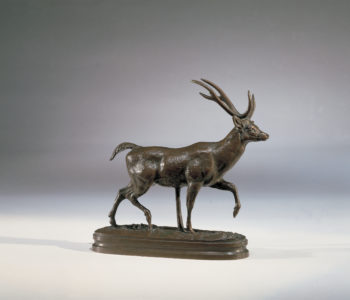 At the age of 23, Barye made his first entry at the Salon, in the section of medals and hoped to win a Prix de Rome. Although he received an honourable mention, it would be twelve years before he received recognition. By 1824 Barye’s domestic commitments, supporting a wife and family, required that he take a job with a fashionable goldsmith, Fauconier. A commission received through Fauconier for a stag led Barye to undertake a serious study of zoology and anatomy at the Jardin des Plantes. The head keeper at the Jardin des Plantes would inform Barye when an animal was about to die so that the artist could call to study closely the bone structure of the animal he could only normally sketch from behind bars.