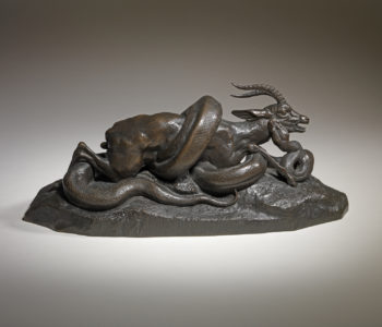 By 1831 Barye left Fauconier and the same year his model of a “Tiger Devouring a Gavial” was well received by the public as was his “Lion Crushing a Serpent” the following year. These two dramatic pieces splendidly depict the combat of animals in the wild, a subject that was to appear frequently in Barye’s sculpture.