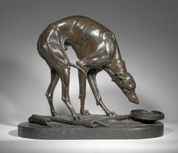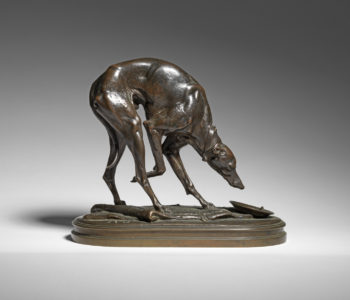 Much of Jacquemart’s work arose through commissions and he produced many important monumental works including “Two Eagles” for the fountain of Saint-Michel, the “Sphinxes” for the fountain du Chatelet, “Four Lions ” for a bridge in Cairo and a life-size cast iron Rhinoceros for the Trocadero in Paris, which also includes the work of Fremiet, Cain and Rouillard. This sculpture can now be found on the esplanade of the Musée D’Orsay. As well as these monumental pieces, Jacquemart sculpted several fine life-size models of animals, particularly Hounds, for commercial release. These were made in cast iron by the Barbezat foundry, Val d’Osne, near Paris, a company well known as manufacturers of fine decorative iron work. These striking and decorative items were very fashionable and adorned country properties where they can still be seen today. A fine pair can be seen at Woburn Abbey in Bedfordshire.