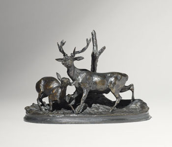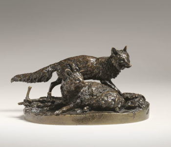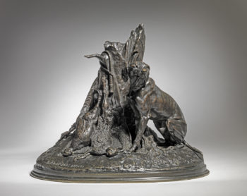 During his lifetime, Mene distinguished and in some respects distanced himself from the ‘Father of the Animalier School’, Antoine-Louis Barye by capturing the more delicate side of the animal world and eliminating the natural violence in animals that Barye captured so well. The delicacy and natural form in his sculpture was, in part, a result of the influence of the painters Landseer and Carle Vernet. From Landseer, Mene found not only subject matter but an expressive element – sentimentality. Landseer’s strong influence can be readily seen in Mene’s large and intricate model of ‘After the Hunt in Scotland’. From Vernet, Mene captured the verve and spirit of the painter’s compositions. By incorporating these elements into his art, Mene’s sculptures possessed a character and natural appeal of their own. Over a century later Mene has emerged as one of the foremost sculptors of the ‘Animalier’ school and surpassed all others in his portrayal of animals in the realist form.