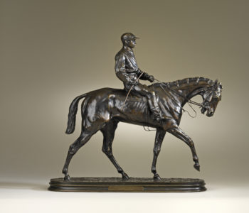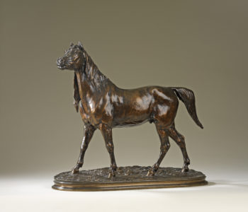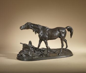 In 1838, he started his own foundry and held his first exhibition at the Salon; where he was to become a regular contributor until his death. Mene won four medals at the Salon and at major exhibitions, receiving the Cross of the Legion d’honneur in 1861 and two first class medals at the London Exhibitions of 1855 and 1861. One of Mene’s finest and most successful sculptures, ‘L’Accolade’ (Arab Mare and Stallion) was first exhibited in wax at the Salon of 1852, in bronze in 1853, and at the Exposition Universelle of 1855. An example of this work is now in the collections of the Louvre. Other popular models exhibited at the Salon during Mene’s lifetime include his ‘Mare and Foal’ exhibited in 1868 in wax and 1869 in Bronze and ‘Vainqueur de Derby’ exhibited in wax in 1863 and bronze in 1864. During his lifetime only one of his works, ‘The Mounted Huntsman and his Hounds’ was acquired by the State. Now, however, examples of Mene’s work can be found in other French museums and the Ashmolean Museum in Oxford, which has the wax model of ‘Winner of the Race’ originally exhibited at the Salon of 1866.