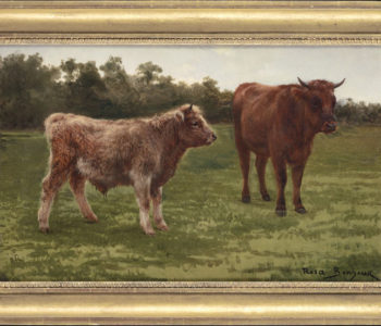 Bonheur kept a variety of different animals at her home at the Chateau de By in Thomery, beside the forest of Fontainbleau, but had a particular fondness for cattle and sheep which she depicted in pastures near her home. Following a visit to Scotland in 1856 (when she met Queen Victoria, Ruskin, Landseer, and many other notable figures), she was to fall in love not only with Scotland’s particular breeds of cattle but also with the highlands whose romantic scenery she would include in many of her works. Many of these she retained in her own personal collection.
