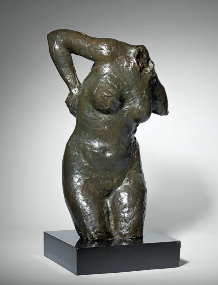 A fine quality, early twentieth century bronze model of a torso entitled ‘Woman Rubbing her Back with a Sponge’ by Edgar Degas (French, 1834-1917). This bronze was produced using the lost wax casting method at the Hebrard Foundry, Paris. Before casting it was signed, inscribed and numbered in the wax ‘Degas’, ‘A. A. Hebrard Cire Perdue’. It has a brown and green patina with reddy undertones.