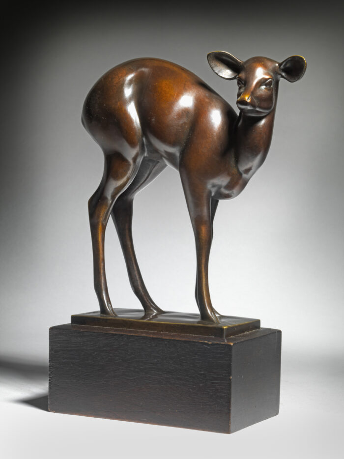 A fine quality, early twentieth century bronze model of an antelope entitled ‘Antilope Dos Rond’ by Armand Petersen (French / Swiss 1891-1969) . This sculpture was cast in bronze by the lost wax process. Before casting it was signed and inscribed in the wax ‘A. Petersen’. It has a warm brown patina with gold undertones.