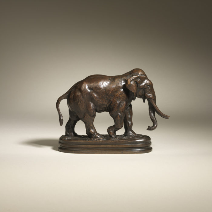 A fine quality, mid-nineteenth century bronze model of an ‘Asian Elephant’ by Antoine-Louis Barye, French (1796-1875). This bronze was produced using the sand cast process at the Atelier Barye / Brame. It is signed ‘BARYE’ and has a mid brown patina with reddy brown undertones.