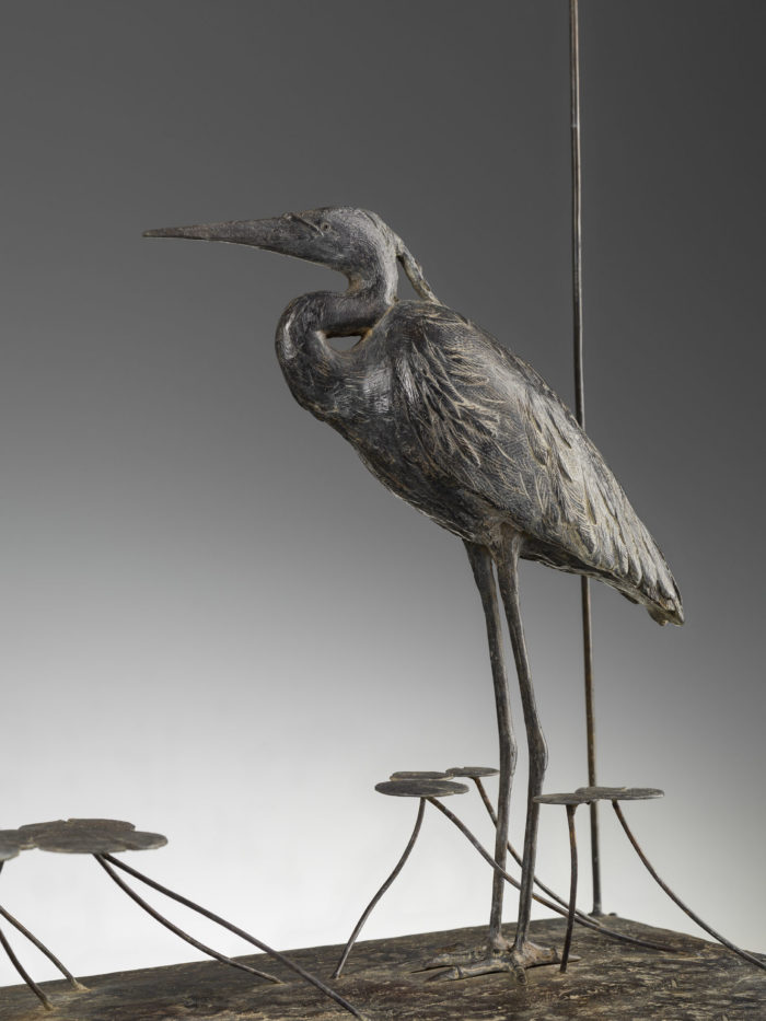 An original, contemporary, bronze sculpture entitled ‘Bolgheri, Heron and Lotus’ by Nicola Lazzari (Contemporary, b. Florence, 1957). This bronze is from a limited edition of 12 and has a brown patina.
