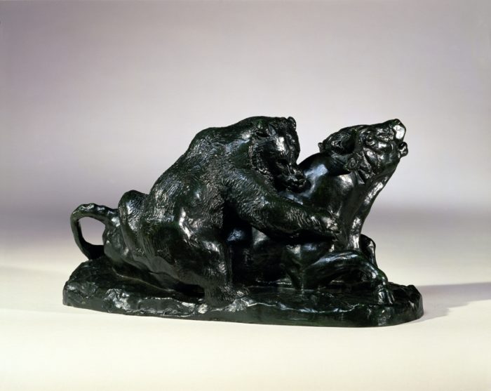A fine quality nineteenth century, atelier bronze model of a ‘Bull Attacked by a Bear’, entitled ‘Taureau Terrasse par un Ours’, by Antoine-Louis Barye (French, 1796-1875). This bronze, signed ‘Barye’, was cast in the artist’s atelier and has a dark green to black patina.
