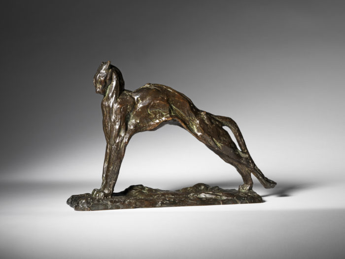 A fine quality, twentieth century bronze model of a ‘Cat Stretching’ by Alberic Collin (Belgian, 1886 – 1962). This bronze was cast by the lost wax process at the C. Valsuani Foundry, Paris. Before casting it was signed and stamped in the wax: ‘Alberic Collin’, ‘C Valsuani Cire Perdue’. This example has a warm brown patina with red and green undertones.