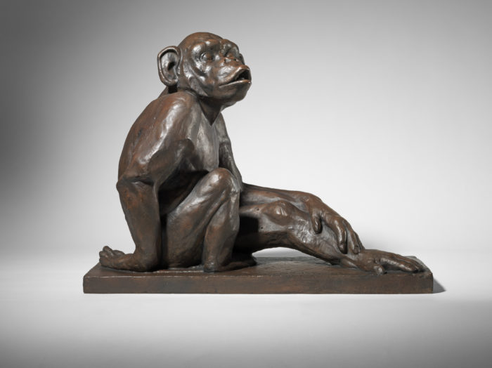 A good quality, early twentieth century patinated plaster model of a ‘Chimpanzee’ by Thierry Van Ryswyck (Belgian, 1911-1958). This plaster is signed ‘T. van Ryswyck’. It has a brown patina.