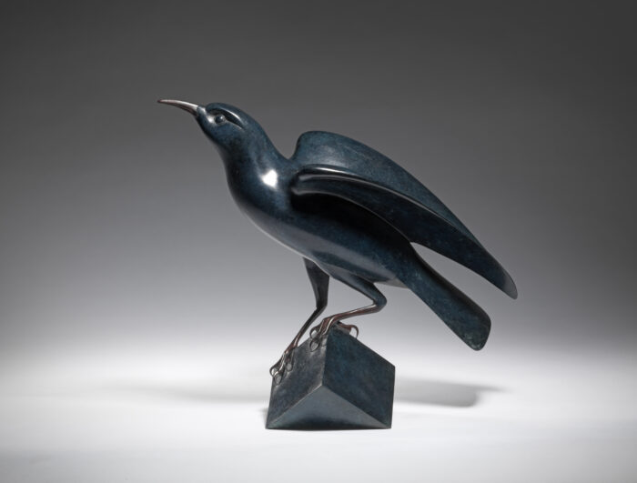 A fine quality, contemporary bronze model ‘Chough’, 2011 by Geoffrey Dashwood, (British, b. 1947). This bronze is from an edition of 12, is signed ‘Dashwood’ and has a mottled deep blue patina.