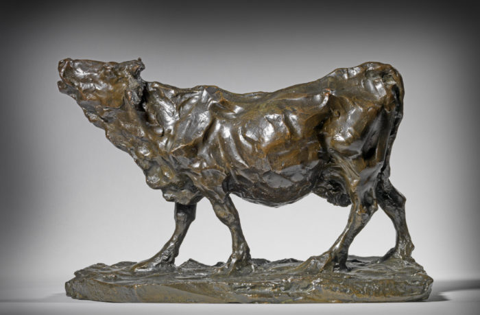 A fine quality, rare, early twentieth century bronze model of a cow lowing entitled ‘Vache Meuglant’ by Rembrandt Bugatti (Italian, 1884-1916). This bronze was producing using the lost wax process for Alberto Grubicy by the Giudici e Strada Foundry, Italy. Prior to casting it was signed and dated in the wax. It has a warm brown patina with golden brown undertones.