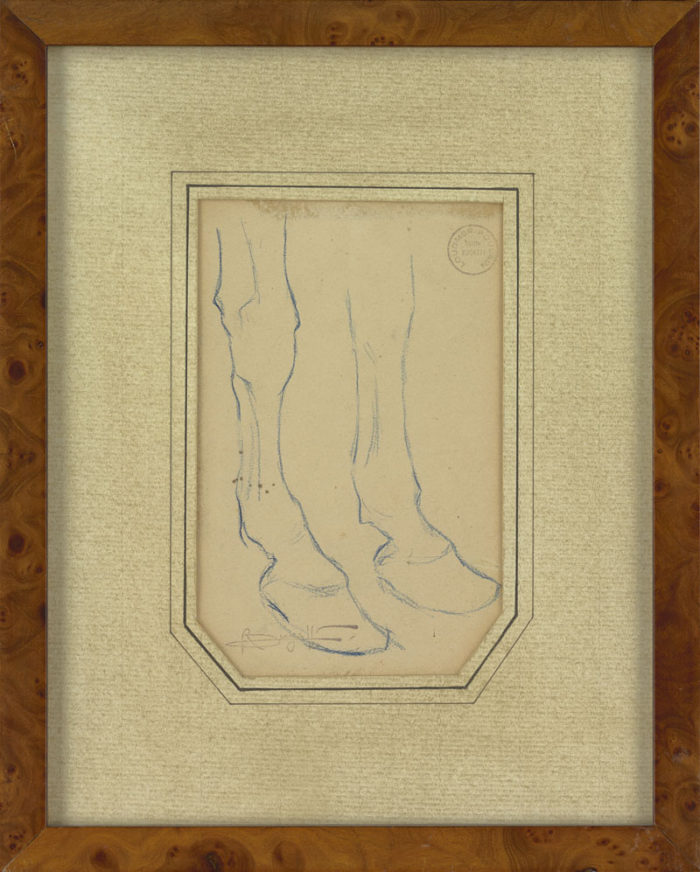 A rare, early twentieth century drawing in blue crayon on paper of a ‘Horse’s Hooves’ by Rembrandt Bugatti (Italian, 1884-1916). This work on paper bears a stamp of the artist’s signature ‘Bugatti’ on the left hand bottom corner and it is stamped with the ‘Loudmer Poulain Vente Bugatti’ mark from the 1979 studio sale.