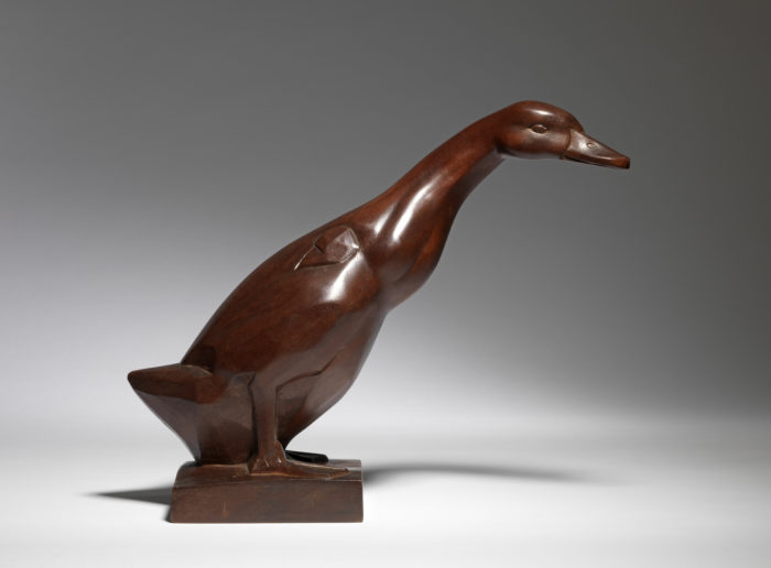 An early twentieth century, mahogany model of a ‘Duck’ by Émile Just Bachelet (French, 1892-1981). This sculpture was carved directly into the wood. It is signed, inscribed and stamped ‘J. Bachelet’, ‘Édition S.A.S. Paris’, ‘MADE IN FRANCE’.