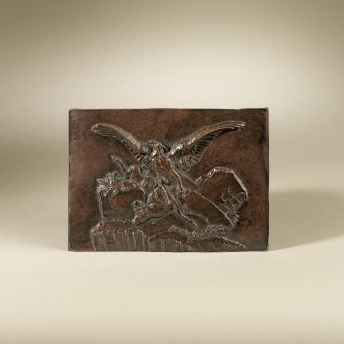 A rare, fine quality, mid nineteenth century bronze plaque of an ‘Eagle with an Ibex’ by Antoine-Louis Barye (French, 1796-1875). This bronze signed ‘Barye’, has a dark brown to black patina with lighter reddy brown highlights.