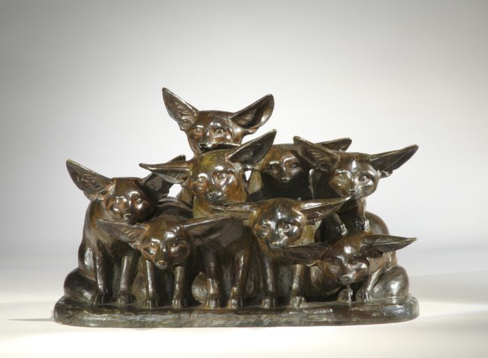 A highly unusual, rare, fine quality, early twentieth century bronze model of a group of eight fennec foxes entitled ‘Fennecs du Sahara’. This sculpture was cast in bronze by the lost wax process at the Claude Valsuani Foundry in Paris. Before casting it was signed and stamped in the wax. It has a warm brown patina with black undertones.