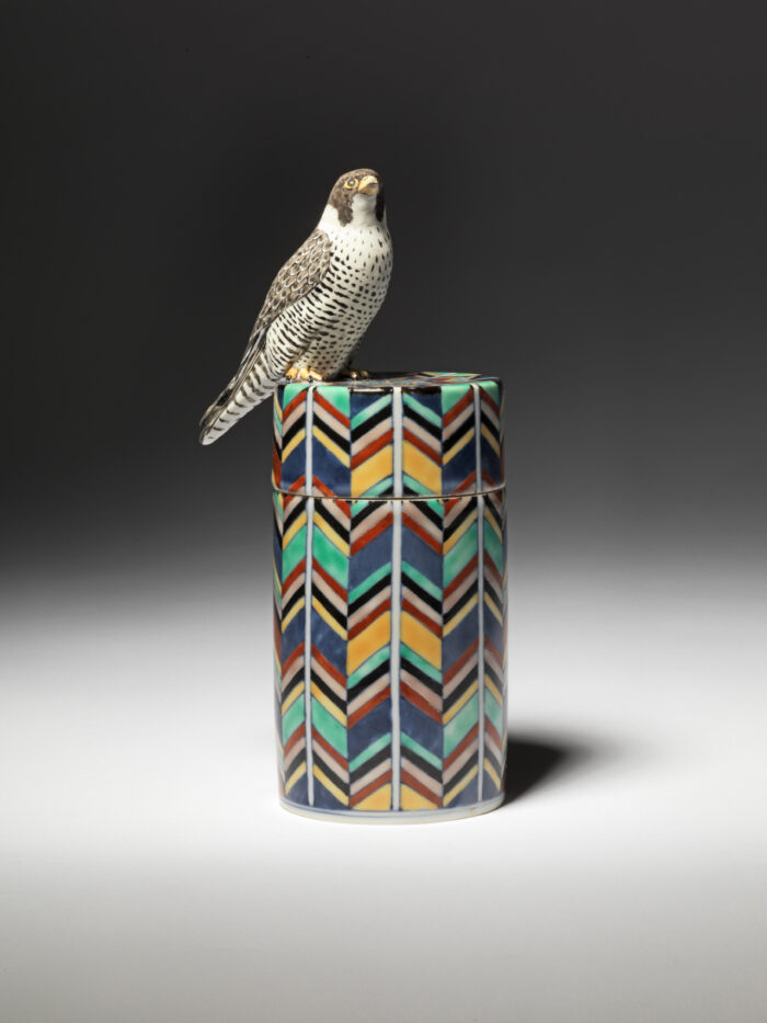 An original, unique, contemporary ceramic sculpture entitled ‘Falcon and Feathers pattern box’ by Kensuke Fujiyoshi (Japanese, b.1966). This porcelain sculpture is hand painted and glazed, made in 2021 by Kensuke Fujiyoshi at his studio and kiln, Fukuoka, Japan.