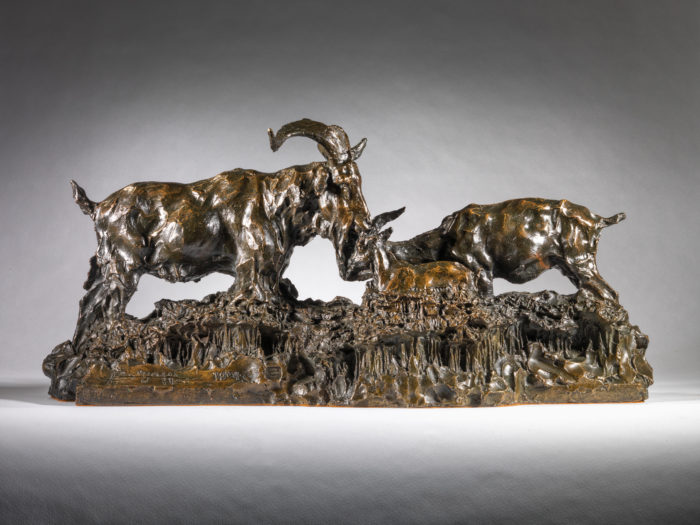 A unique early twentieth century bronze model of a Goat Family by Rembrandt Bugatti. This bronze was produced by the lost wax casting method at the Claude Valsuani Foundry, Paris. Prior to casting it was signed and stamped in the wax. This cast has a medium to dark brown patina with dark brown to black undertones.