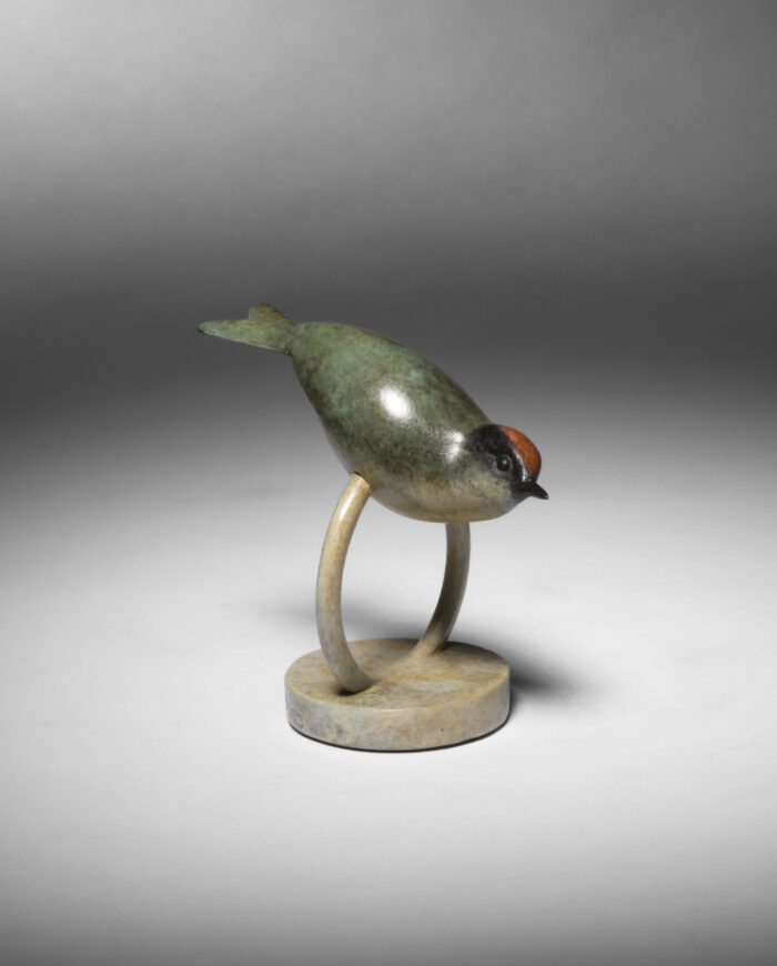 A fine quality, contemporary bronze model of a ‘Goldcrest’, 2017 by Geoffrey Dashwood, (British, b. 1947). This bronze from an edition of 25, is signed ‘Dashwood’ and has a mottled green and blue patina with beige detail.