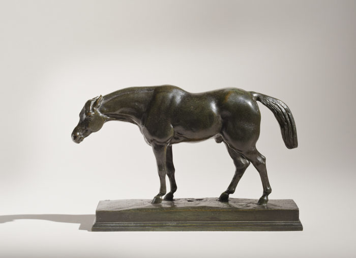 A fine quality mid-nineteenth century bronze model of a ‘Half-Blood Horse’ with head down, by Antoine-Louis Barye, French (1796-1875). This bronze, signed ‘Barye’ has a dark brown patina with green and gold highlights.