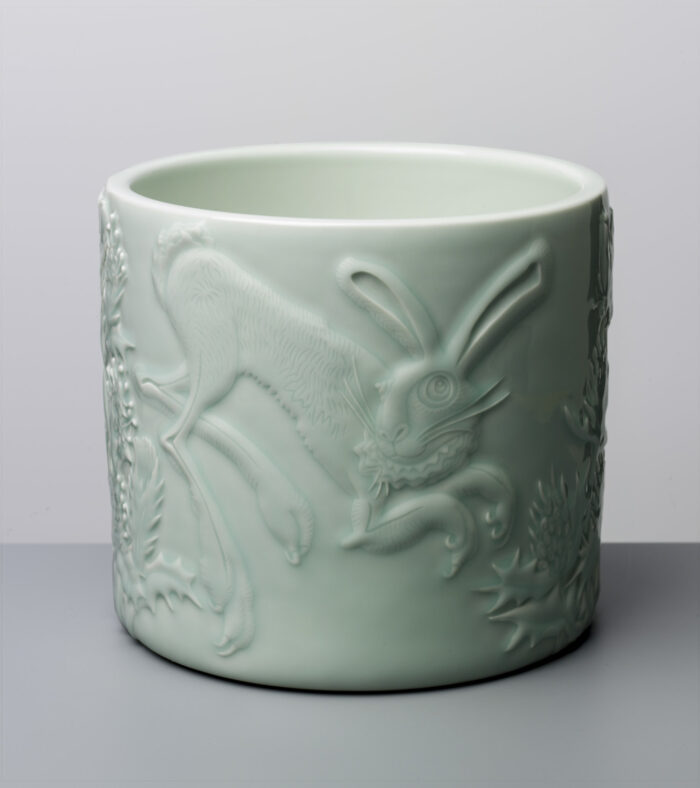 Hand-carved, celadon glazed porcelain pot, boxed.