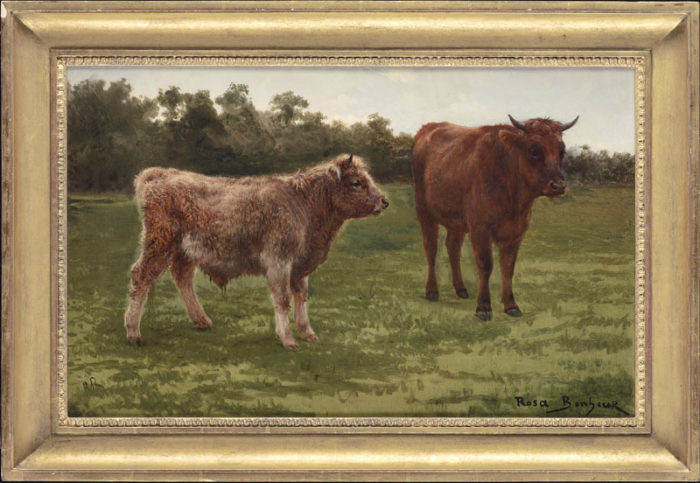 A fine quality, nineteenth century oil painting on canvas of ‘Two Cattle in a Field’ by Rosa Bonheur (French, 1822-1899). This painting is signed ‘Rosa Bonheur’.