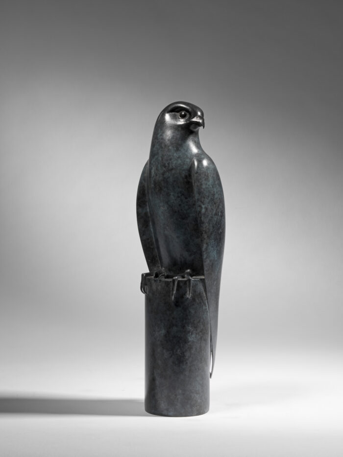A fine quality, contemporary bronze model of a ‘Hobby’, 2019 by Geoffrey Dashwood, (British, b. 1947). This bronze is from an edition of 12, is signed ‘Dashwood’ and has a mottled blue patina.