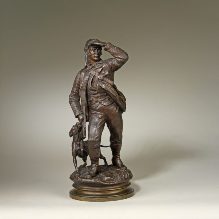 A charming, unusual, good quality, nineteenth century bronze model of a ‘Hunter with Hound’ by Jules Moigniez (French, 1835 – 1894). This bronze, signed ‘J Moigniez’ has a medium reddy brown patina with darker undertones.