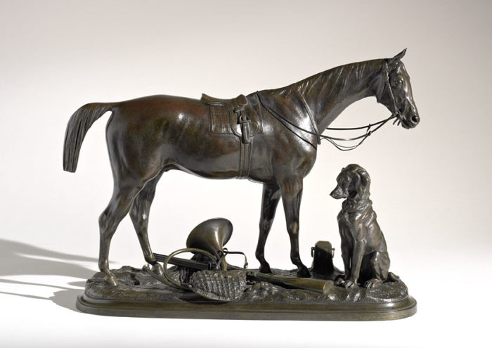A fine quality, nineteenth century bronze model of a ‘Horse with Hound’, by Pierre Lenordez (French, 1815-1892) and Victor Boyer. This bronze, signed ‘P. Lenordez’ and ‘V. Boyer’, was cast in France and has a dark brown patina with reddy brown undertones.