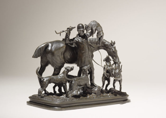 A rare fine quality nineteenth century bronze model of a ‘Huntsman, Fox and Hounds’ by Joseph Edgar Boehm (French, 1834-1890). This bronze, signed by the artist, has a medium brown patina with dark brown undertones.