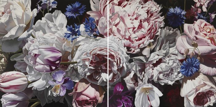 A unique, original, contemporary oil painting diptych entitled ‘Ipervanitas, 1723’ by Sandra Casagrande and Roberto Recalcati (Italian, b.1968 and 1969), painted at their Milan Studio in 2020.
