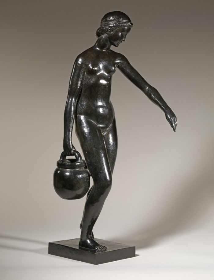 An early, twentieth century, bronze model of a girl carrying a water pitcher, entitled ‘Jeune fille à la cruche’ by Joseph Bernard (French, 1866 – 1931). This bronze was cast by the Claude Valsuani Foundry, Paris using the lost wax process. Prior to casting it was signed and stamped ‘J. Bernard’, and ‘C. Valsuani Cire Perdue’. This cast has a rich dark brown patina with reddy brown highlights and black undertones.