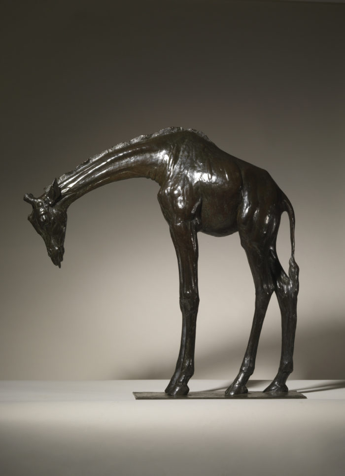 A fine quality, early twentieth century impressionistic bronze model of a giraffe entitled ‘Girafe baissant la tête’ by Rembrandt Bugatti (Italian, 1884-1916). This sculpture was produced using the lost wax process at the Hébrard Foundry, Paris. Before casting it was signed and stamped in the wax. It has a medium brown patina with rich reddy brown undertones.