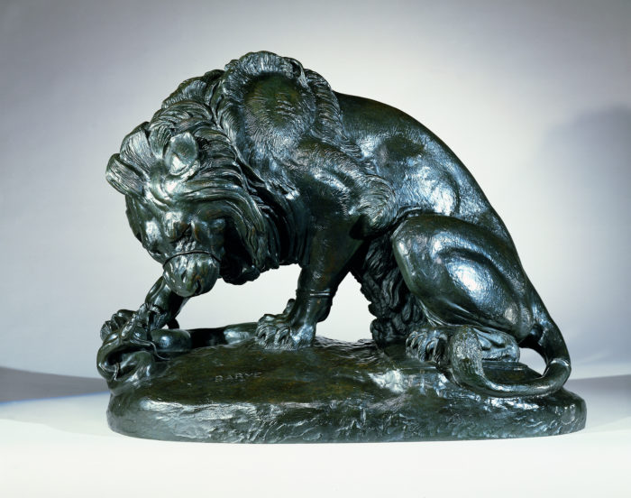 A rare fine quality nineteenth century bronze model of a ‘Lion and Serpent’, by Antoine-Louis Barye, French (1796-1875). This bronze, signed ‘BARYE’, was cast in the Atelier Brame as the ‘chef modèle’ and has a rich dark green patina with black undertones.