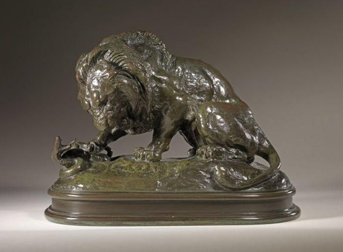 A fine quality, mid-nineteenth century atelier bronze model of a ‘Lion and Serpent’ by Antoine-Louis Barye (French, 1796-1875). This bronze is signed ‘Barye’ and was cast in the sculptor’s own atelier. It has a feuille d’automne patina with green and orange undertones.