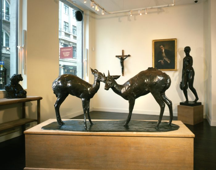 A unique, fine quality, early twentieth century, life-size bronze model of two antelopes, entitled ‘Mes Antilopes’, by Rembrandt Bugatti (Italian, 1884-1916). This bronze was cast by the lost wax process at the Hébrard Foundry in Paris. Before casting it was signed, stamped, inscribed and dated in the wax ‘R. Bugatti’, ‘A.A. Hébrard Cire Perdue’ ‘Piece Unique’, ‘1908’. It has a rich dark brown patina with reddy brown undertones.