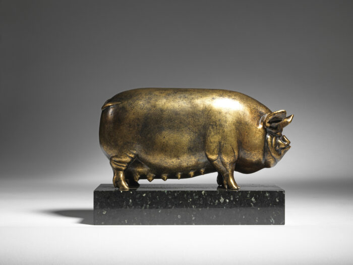 A fine quality, early twentieth century bronze model of a middlewhite sow “Wharfedale Royal Lady” by Herbert Haseltine (American, 1877-1962). This bronze was cast by the lost wax casting process and is signed, dated and numbered on the original marble base ‘© Haseltine MCMXXVIII’, It has a rich gilt patina with subtle dark brown and black overlay.