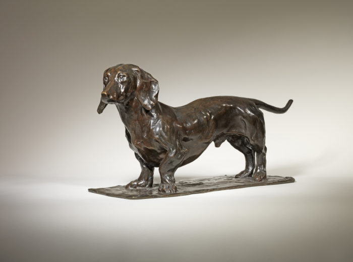 A fine quality, early twentieth century impressionistic bronze model of a Dachshund entitled ‘Mon Chien’ by Rembrandt Bugatti. This sculpture was cast in bronze using the lost wax process at the Hébrard Foundry, Paris. Before casting it was signed, stamped and numbered in the wax: ‘R. Bugatti’, ‘ A.A. Hébrard Cire Perdue. This cast has a medium brown patina with golden undertones.