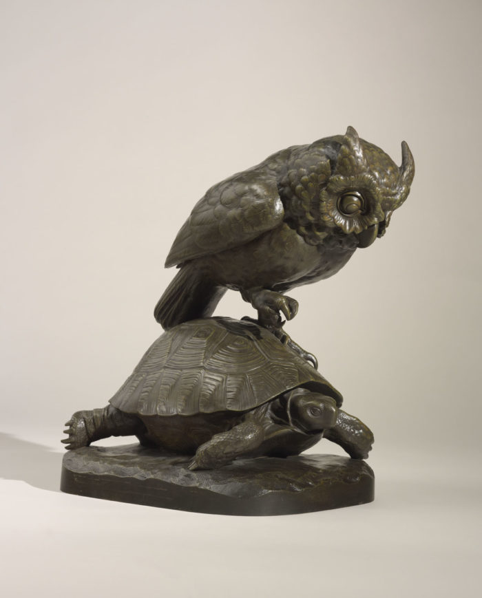 A good quality, nineteenth century bronze model of an ‘Owl and Tortoise’ by Jean Baptiste Clesinger (French, 1814 – 1883). This bronze, signed ‘J.CLESINGER’ and inscribed ‘MAISON MARNYHAC. I Rue de la Paix’ has a dark brown patina with lighter green brown undertones.
