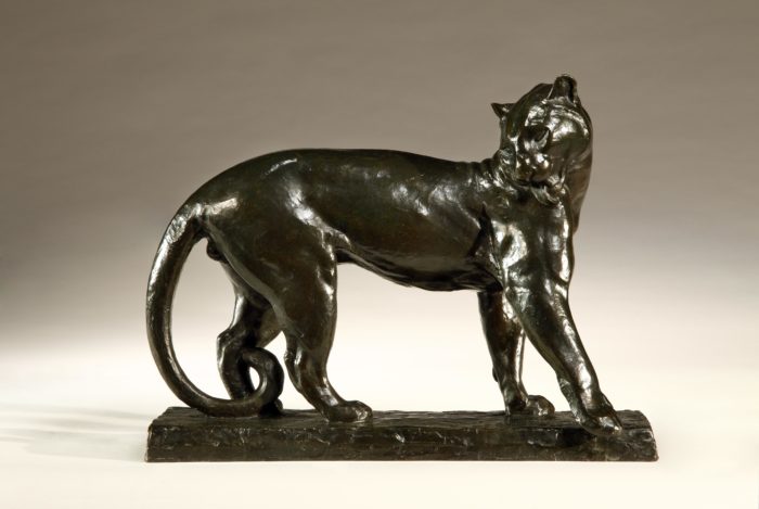 A fine quality, twentieth century bronze model of a ‘Seated Panther Grooming’ by Charles Delhommeau (French, 1883-1970). This bronze was produced using the lost wax process at the Leblanc Barbedienne & Fils Foundry, Paris. Before casting it was signed in the wax ‘C. Delhommeau’ and stamped in the wax with the foundry seal. It has a medium brown patina with green undertones.