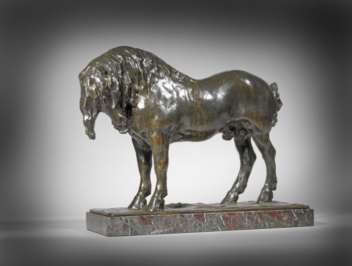 A fine quality, rare, early twentieth century bronze model of a Percheron Stallion entitled ‘Étalon Boulonnais’ by Rembrandt Bugatti (Italian, 1884-1916). This bronze was cast by the lost wax process at the Hébrard foundry, Paris. Before casting it was signed and stamped in the wax ‘Rembrandt Bugatti’, ‘A. A. Hébrard’, ‘Cire Perdue’. This bronze has a rich dark brown patina.