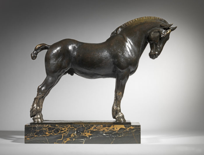 A rare, fine quality, early twentieth century bronze model of a ‘Horse’ by Edouard Marcel Sandoz (Swiss, 1880-1971′. This bronze was produced using the lost wax process at the Robecchi Foundry in Paris. Prior to casting it was signed, stamped and inscribed. It has a dark brown patina with unusual golden highlights to the mane, tail and feet.