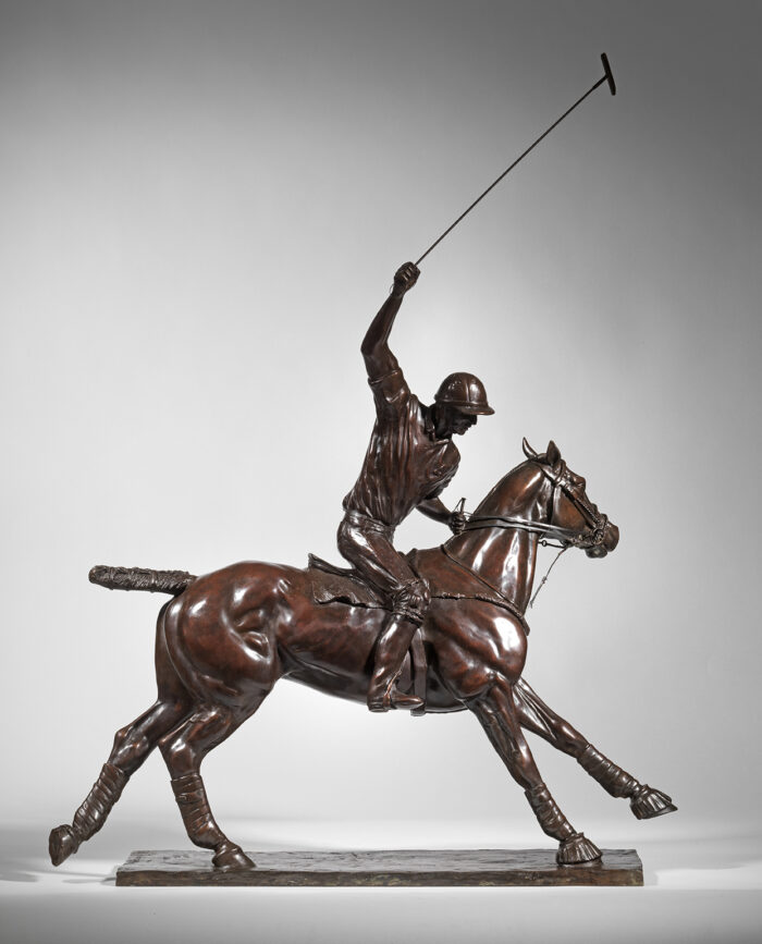A contemporary bronze model of a polo player entitled ‘ Polo Offside Forehand’ by Gill Parker (English, contemporary). This bronze is cast in a limited edition of 9 and has a dark brown patina with rich reddy brown undertones.