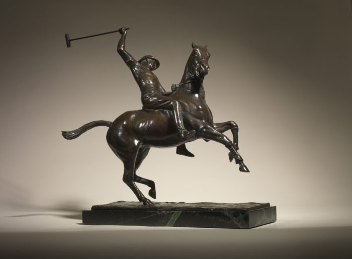 A fine quality, rare, early twentieth century bronze model of Polo Player, ‘Nearside Backhand’, by Georges Malissard (French,1877-1942). This sculpture was cast by the lost wax process at the Attilio Valsuani Foundry, Paris. Before casting it was signed and stamped in the wax: ‘G. Malissard, ‘A. Valsuani Cire Perdue’, ‘Bronze’. It has a medium brown patina.