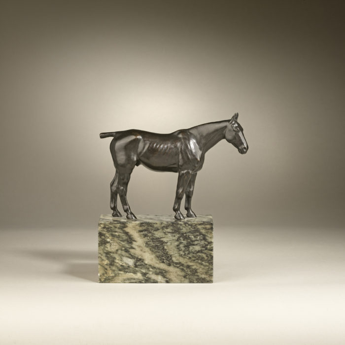 A rare, fine quality, early twentieth century bronze model of a ‘Polo Pony’ by Herbert Haseltine (American, 1877-1962). This bronze has a rich dark brown patina with reddy brown highlights and is mounted on its original antique green veined marble base and inscribed on a bronze plaque affixed underneath is ‘British Champion Animals, Second Set, Polo Pony © Haseltine.
