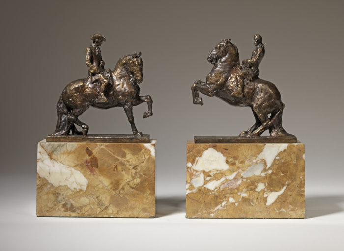 A fine quality pair of early twentieth century bronze models of ‘Portuguese Bullfighters’ by Herbert Haseltine (American, 1877 – 1962). These bronzes were cast by the lost wax process at the Claude Valsuani Foundry in Paris. Before casting they were both signed and stamped in the wax ‘© Herbert Haseltine’ and ‘C. Valsuani Cire Perdue’. They have burnished red gold and brown patinas and are mounted on their original antique yellow marble bases.