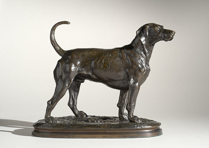 A good quality, nineteenth century bronze model of a pointer entitled ‘Rabat Joie’ by Arthur Waagen (French, 1833-1898). This bronze, inscribed ‘Rabat Joie’ and marked with an ‘S’ hunting brand in the side of the pointer, has a medium brown patina with lighter brown highlights.