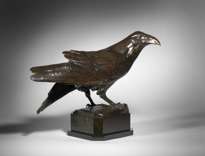 A good quality, early twentieth century model of a ‘Raven, by Ludwig Vordermayer (German, 1868-1933). This bronze was cast at the Lauchhammer Foundry in Bradenburg, Germany. This bronze is stamped ‘LAUCHAMMER BILDGUSS’ and bears a circular stamp. It has a dark brown patina with red and golden undertones.