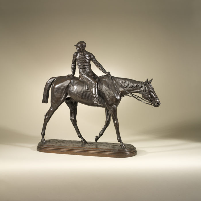 A fine quality, rare, nineteenth century bronze model of a ‘Racehorse with Jockey up’, entitled ‘Retour au Pesage’, by Isidore Bonheur (French, 1827 – 1901). This bronze, signed ‘I Bonheur’ was cast by the Peyrol Foundry, Paris, and bears the cold stamp ‘Peyrol’. This cast has a dark brown patina with golden highlights.