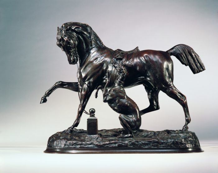 A fine quality, rare, nineteenth century bronze model of a ‘Horse and Greyhound’, by Pierre Lenordez, (French, 1815 – 1877). This bronze, signed ‘P. Lenordez’, and also signed by the artist who sculpted the Greyhound ‘Boyer’, has a dark brown patina with reddy brown undertones.