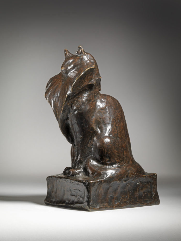 A good quality early twentieth century bronze model of a ‘Large Seated Angora Cat’, by Theophile Alexandre Steinlen (Swiss, 1859 – 1923). This sculpture was produced using the sand casting process in Paris. Before casting, it was signed ‘Steinlen’ and has a dark brown to black patina with golden brown highlights.